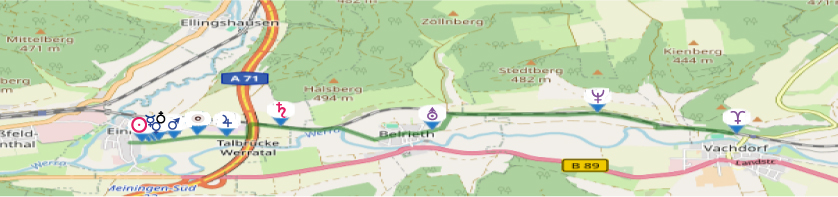 Zwischen Obermaßfeld und Vachdorf in Südwest-Thüringen erstreckt sich ein Planetenweg von der Ortsmitte in Einhausen (Ortsteil von Obermaßfeld) auf dem Werraradweg bis zum Kulturhaus in Vachdorf auf ca. 6 km Länge. Informationen zum Sonnensystem finden sich am Wegesrand auf bunten Tafeln: ansehen